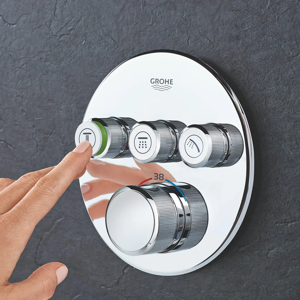 خلاط بانيو دفن سمارت كنترول جروثيرم من جروهي بلمسة كروم لامعة، يوفر تحكمًا دقيقًا بالمياه بثلاث مخارج و بتقنية التحكم الذكي لتجربة استحمام مريحة.