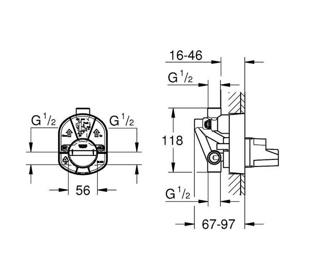 جسم خلاط دفن يتم تركيبه على الحائط، مزود بخرطوشة سيراميك بقياس 46 مم لضبط دقيق وسهل. يحتوي على محدد لتدفق المياه، منافذ علوية وسفلية بحجم 1/2 بوصة، ومحول مدمج مع غطاء. يتم تركيبه باستخدام خيوط لولبية باتجاه عقارب الساعة، ويأتي بدون طقم التشطيب الخارجي.